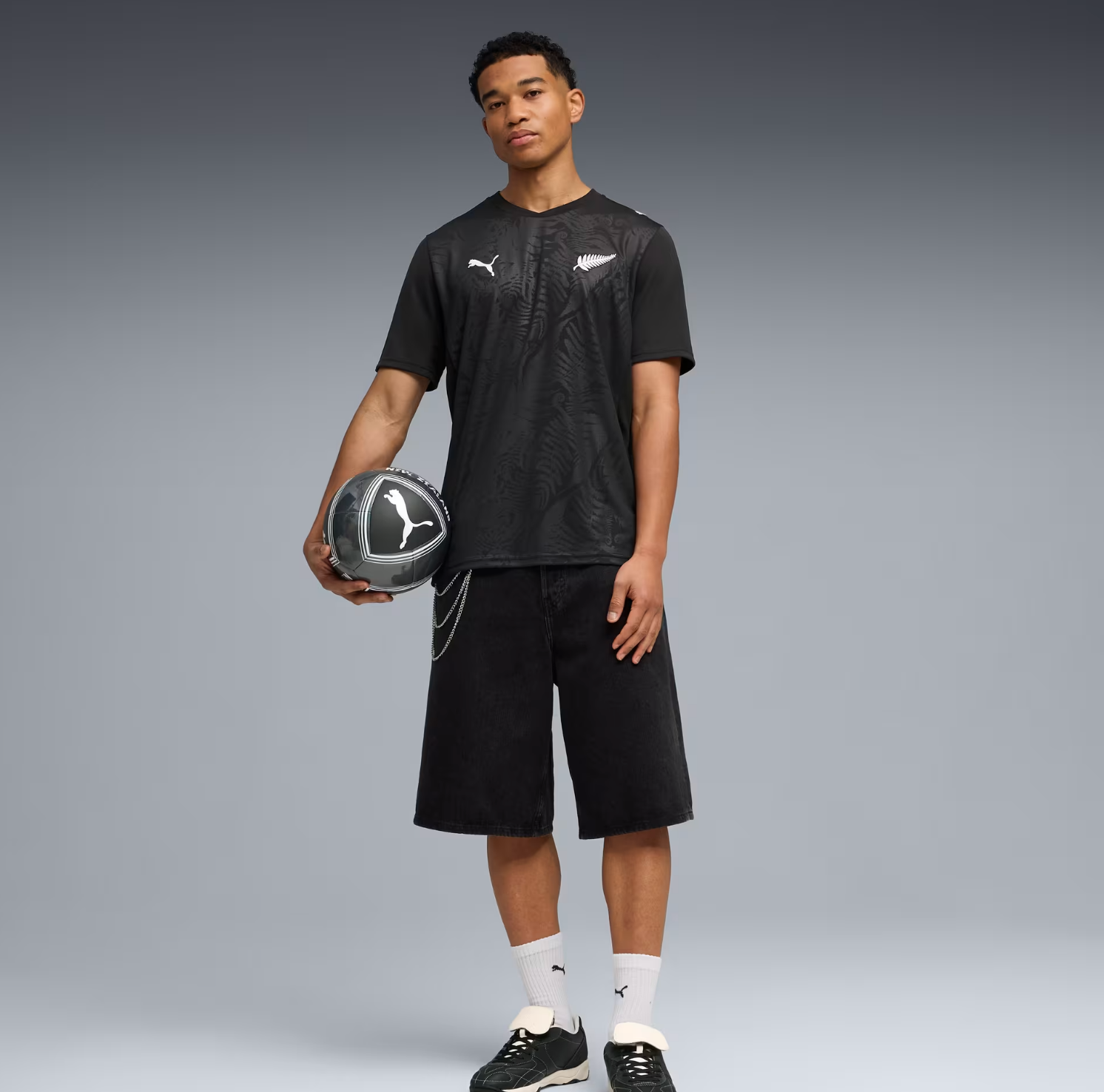 New Zealand’s 2026 home jersey features a sleek Black base with silver detailing, staying true to the All Whites’ bold minimalist identity. Designed with lightweight performance fabric, it offers a clean premium look for matchday support and casual wear.